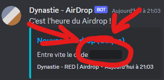 Pour obtenir le code, il faut se rendre dans le channel #air-drop sur notre Discord puis de cliquer sur la partie grise. Suite à cela vous n'avez plus qu'a copier/coller le code sur la Page de l'AirDrop.